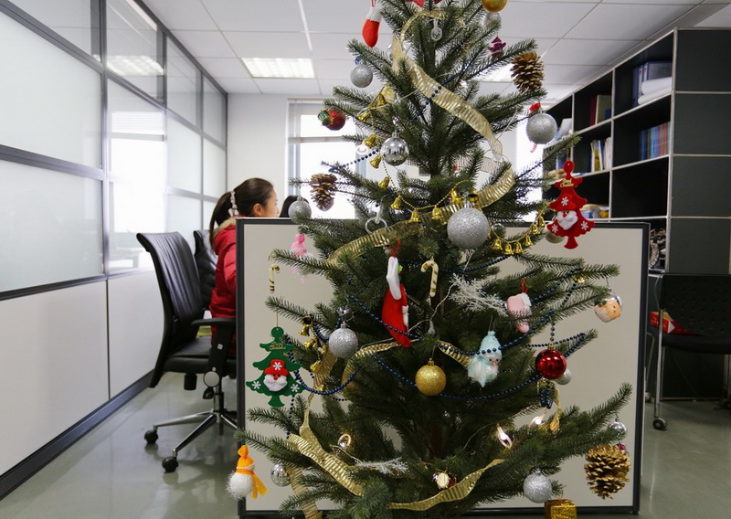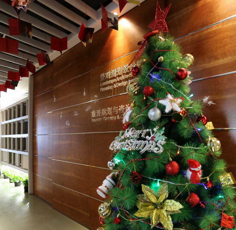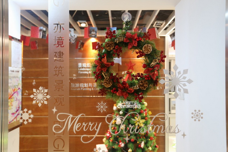 為營造濃厚的節(jié)日氛圍,亦境辦公區(qū)內(nèi)外布置了極富圣誕氣息的各類裝飾。中庭矗立的圣誕樹上,精心裝點(diǎn)了色彩絢麗造型優(yōu)美的金松果、小紅靴、粉雪人等掛件及精美的圣誕小禮物。