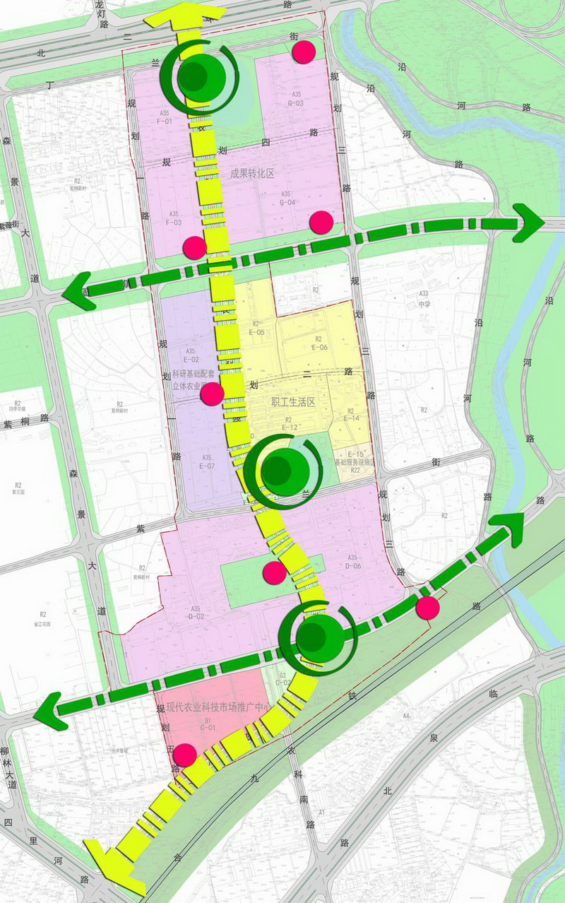 ■“一帶”:貫穿基地南北,依托農(nóng)科路形成縱向農(nóng)業(yè)展示帶,著重強調(diào)科研基礎配套及立體農(nóng)業(yè)展示區(qū)的景觀形象;