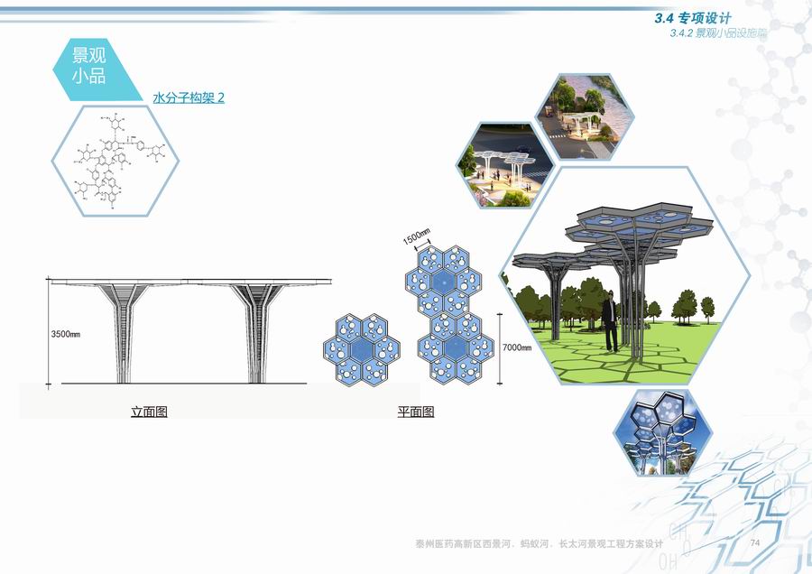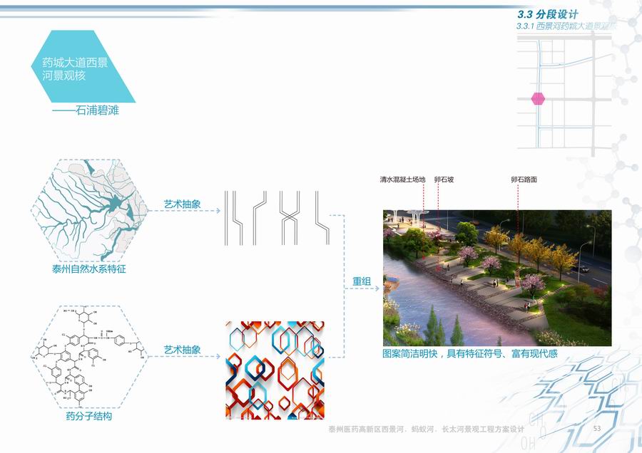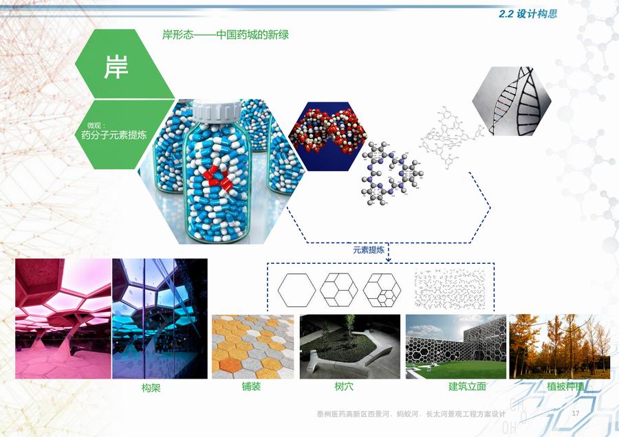 “岸”的設(shè)計(jì):宏觀上將醫(yī)藥高新區(qū)積極向上、刻苦研發(fā)的精神提煉成為剛勁的線條與現(xiàn)代感的圖形應(yīng)用于岸的造型、景觀小品的形式、鋪裝的樣式、種植面的造型上,將原有單調(diào)的水岸形式打造成為既現(xiàn)代又富有創(chuàng)新的綠色生態(tài)帶。微觀上,將藥分子的造型解構(gòu)、重組,提取圖形元素作為坐凳、樹穴、小品的造型與鋪裝面的造型符號(hào),使行人能夠感受到藥城的獨(dú)特感與科技感。