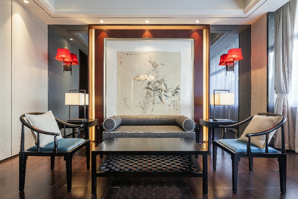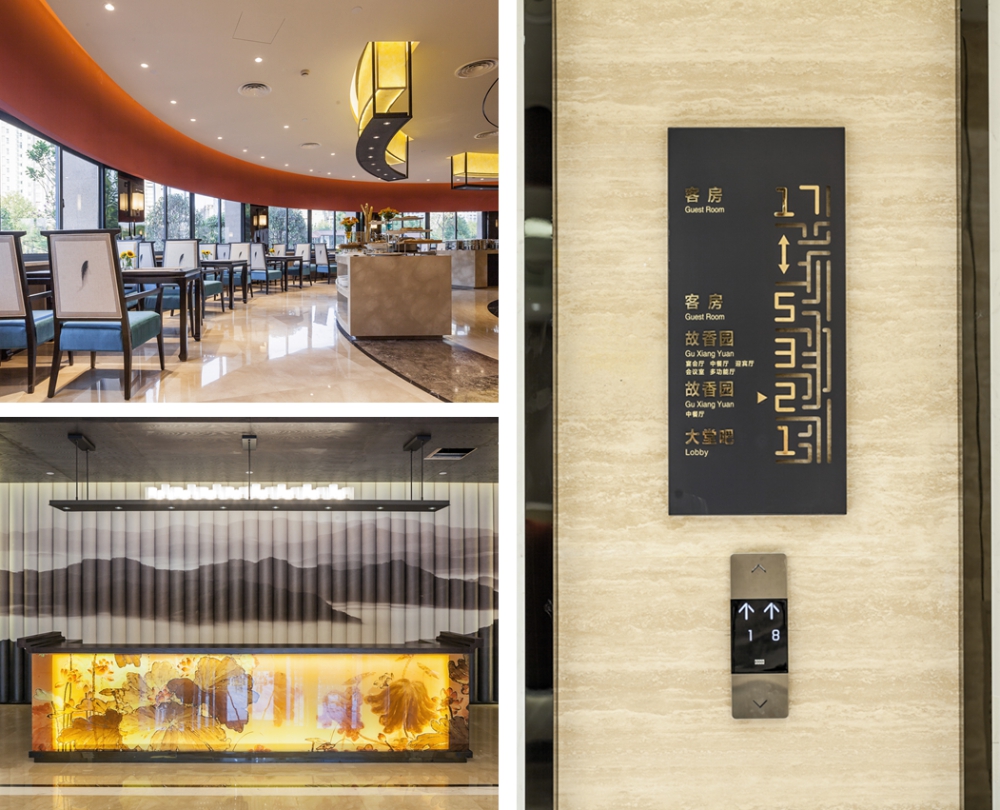 建筑入口簡(jiǎn)潔開(kāi)闊,銜接室內(nèi)室外的空間,檐口弧線與餐廳幕墻一筆連通、錯(cuò)落有致。使整棟建筑拔地凌空、氣勢(shì)恢宏,是名至實(shí)歸的“地標(biāo)”酒店建筑。