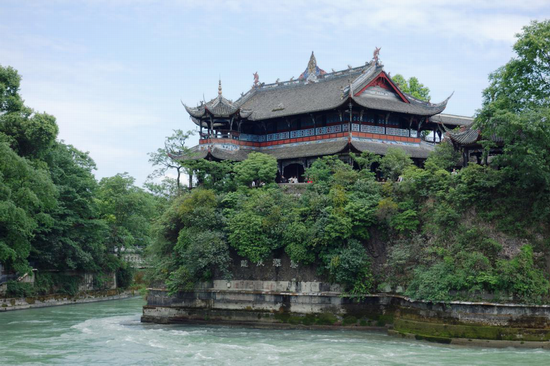 飛沙堰溢洪道又稱“泄洪道”,是都江堰水利工程中第二大主體工程。通過巧妙的設(shè)計,可以疏通洪水、分流,還具有強大的排沙石功能,這里也是都江堰確保成都平原不受水災(zāi)的關(guān)鍵要害。