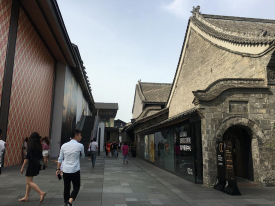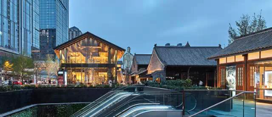 其建筑風(fēng)格秉持“以現(xiàn)代詮釋傳統(tǒng)”的設(shè)計理念,保留古老街巷與歷史建筑,再融入局部2、3層獨棟建筑,優(yōu)化整體建筑肌理。外立面上,川西風(fēng)格的青瓦坡屋頂與格柵配以大面積的玻璃幕墻,以古典穿插現(xiàn)代的手法營造出一片開放自由的城市空間。
