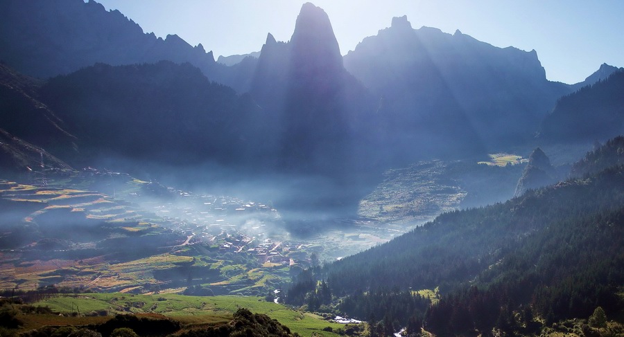 扎尕那是位于甘肅省甘南藏族自治州迭部縣西北30余公里處的益哇鄉(xiāng)的一座古城,被譽為人間的“香巴拉”,宛如藏傳佛教中表述的“極樂園”。俯瞰整個扎尕那景區(qū),她就像是被上帝遺忘在人間的一塊翡翠。云霧繚繞,神秘而祥和。