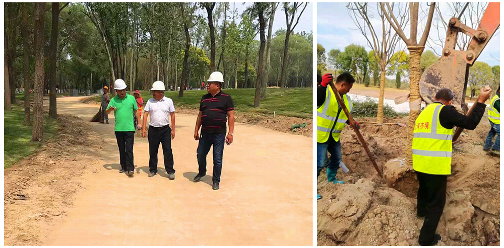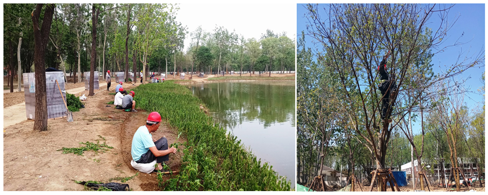 施工中,亦境團(tuán)隊(duì)面對(duì)現(xiàn)場(chǎng)條件復(fù)雜、工期緊張、施工難度大、周邊環(huán)境復(fù)雜等諸多不利因素,積極協(xié)調(diào)各方、白天揮汗工地;晚上,繼續(xù)挑燈夜戰(zhàn),攻克技術(shù)難題。在項(xiàng)目中提出了增施加有機(jī)土等鹽堿土改良方案,改善土壤透氣、透水性能和養(yǎng)料狀況,為實(shí)現(xiàn)植物景觀多樣性打下基礎(chǔ);針對(duì)原高爾夫球場(chǎng)草坪下鋪了50cm厚細(xì)沙的問(wèn)題,亦境團(tuán)隊(duì)綜合考慮苗木栽植及后期養(yǎng)護(hù)情況,多次與甲方協(xié)商后,通過(guò)原地深挖土壤與黃沙攪拌方式來(lái)改善增加表層土壤基質(zhì)。