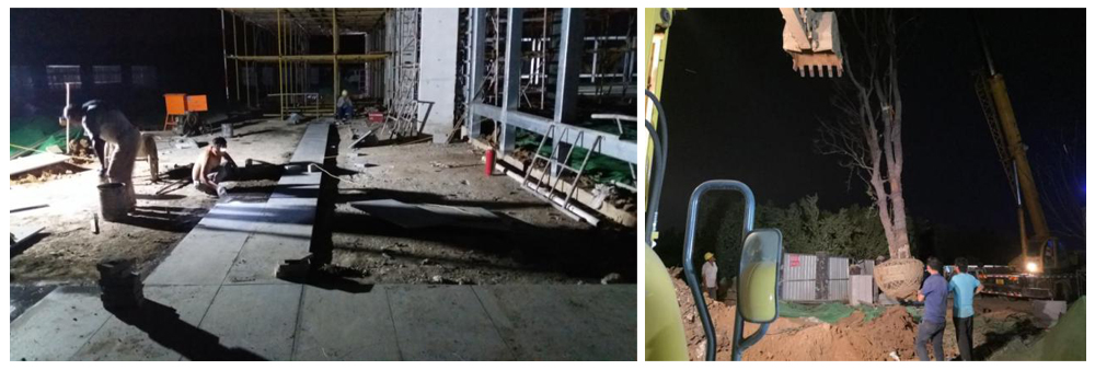 項(xiàng)目一進(jìn)門、二進(jìn)門廊架為鋼結(jié)構(gòu),景觀墻為外掛石材設(shè)計(jì),工程量大,時(shí)間緊促。天氣炎熱,正午時(shí)分鋼結(jié)構(gòu)溫度過(guò)高,不能施工,為保證按時(shí)交付,只能晚上進(jìn)行施工。為搶奪工期,綠化苗木種植也常常夜間加班施工,有些地方及道路苗木車輛運(yùn)輸過(guò)不去,只能靠人工一顆一顆運(yùn)輸,終于保質(zhì)保量的在規(guī)定時(shí)間內(nèi)完成。