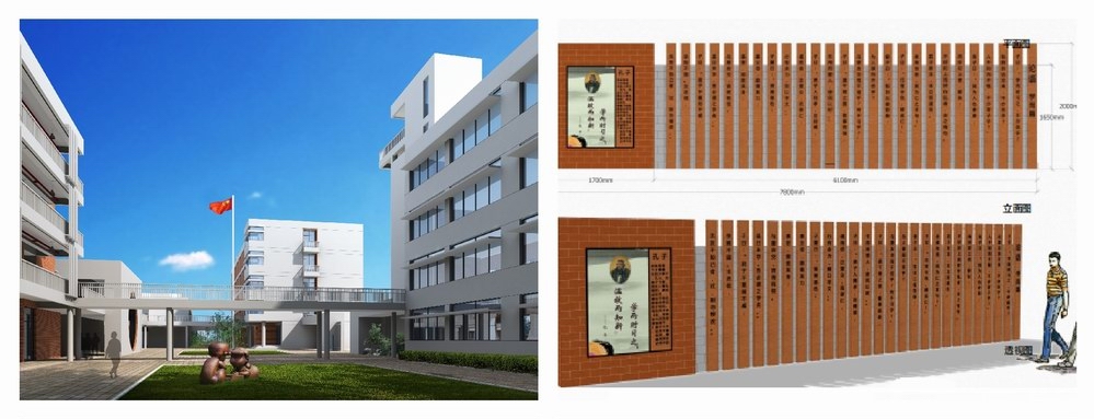 景觀小品:在教學(xué)樓中庭結(jié)合綠植設(shè)置色彩豐富、形式變化的景觀坐凳,貼合該年齡階段小學(xué)生心理對(duì)色彩感受與認(rèn)知,為學(xué)生與教師提供課后在校園內(nèi)交流與休憩的空間。同時(shí)在教學(xué)樓周邊設(shè)置文化景墻與景石雕刻,展示古訓(xùn)勤勉的文化語(yǔ)言。