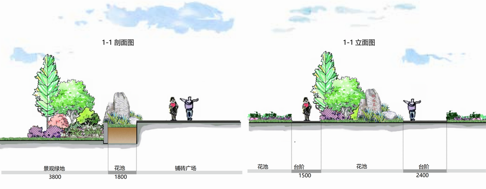 場(chǎng)地鋪裝:整體色系延續(xù)建筑立面以灰紅相間,灰白為主,紅褐為次的風(fēng)格樣式。地面跳躍的線性紅褐色鋪裝與片狀灰白鋪裝相結(jié)合的形式,使校園整體樣式如一棵樹苗在生根發(fā)芽,茁壯成長(zhǎng)。