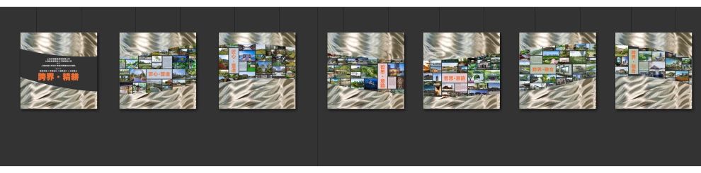 水波紋構(gòu)圖的項目作品影像流,橫跨七塊1.2×1.2米的金屬板面,貫穿一個主題,三大類別,六個特色板塊。水紋構(gòu)圖取意于老子《道德經(jīng)》中遵從的“上善若水”——居善地,心善淵,與善仁,言善信,正善治,事善能,動善時。這也正是本次展出對亦境“亦真亦善,境心之道”的企業(yè)文化理念的詮釋。