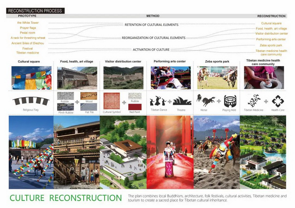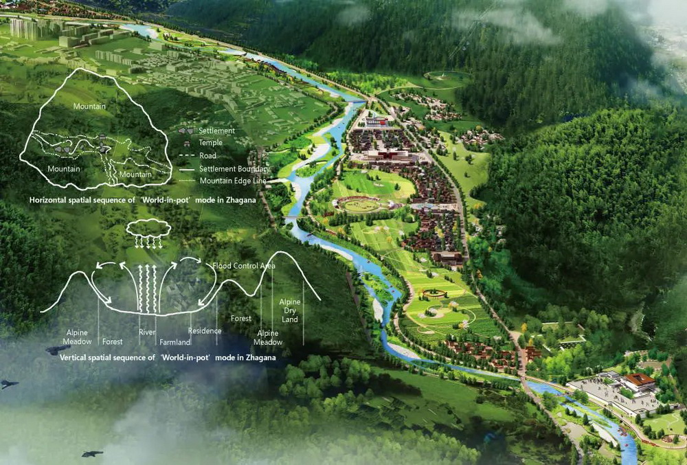 本小鎮(zhèn)引用扎尕那的生態(tài)瑰寶——“壺天模式”與農(nóng)林牧復(fù)合系統(tǒng)的天人合一的生產(chǎn)生活方式進(jìn)行了傳承和重塑;對扎尕那的文化寶藏——藏地文化、藏傳佛教文化、農(nóng)業(yè)文化、建筑文化進(jìn)行傳承與發(fā)展;以旅游業(yè)態(tài)為載體進(jìn)行文化傳承,為藏民參與提供了平臺(tái),切實(shí)引導(dǎo)與促進(jìn)扎尕那大生態(tài)區(qū)的可持續(xù)發(fā)展,綻放人間香巴拉,實(shí)現(xiàn)公眾的共享與共建。