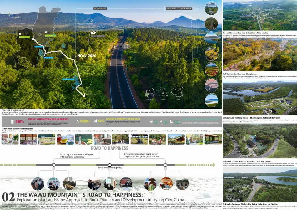 設計提出“旅游+、生態(tài)+、產(chǎn)業(yè)+、可持續(xù)+”的目標與策略,采取“線+點”的景觀模式,構(gòu)建鄉(xiāng)村慢行旅游廊道和特色驛站;營建多樣性棲息地和遷徙廊道,恢復生物多樣性;挖掘鄉(xiāng)土農(nóng)業(yè)資源和民俗文化,推動鄉(xiāng)村旅游、文創(chuàng)產(chǎn)業(yè)與農(nóng)業(yè)的多產(chǎn)業(yè)融合;堅持低維護、低影響的建筑設計、植物搭配和材料選用。旨在打造通往瓦屋山的幸福之路,探索中國溧陽市鄉(xiāng)村旅游發(fā)展的景觀途徑。
