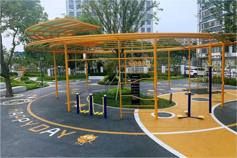 Q+同心花園位于柏廬大橋附近,以明亮活潑的色彩和趣味圖案噴繪讓人眼前一亮。橙色能代表童趣與溫暖,也是Q+同心花園的主打色。各式游樂設(shè)施給孩子們提供了游樂的小天地,鋪裝采用安全、防滑材質(zhì),保證了兒童活動的安全性。涼亭和休憩座椅給大人和孩子提供了短暫休息的場所。