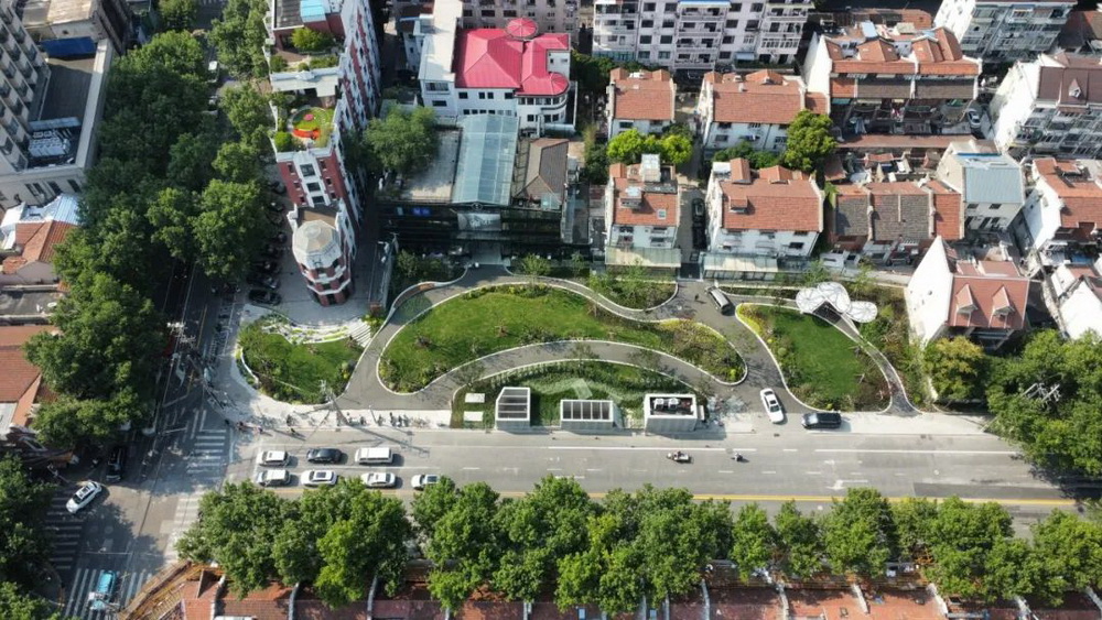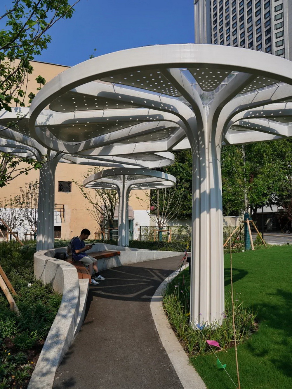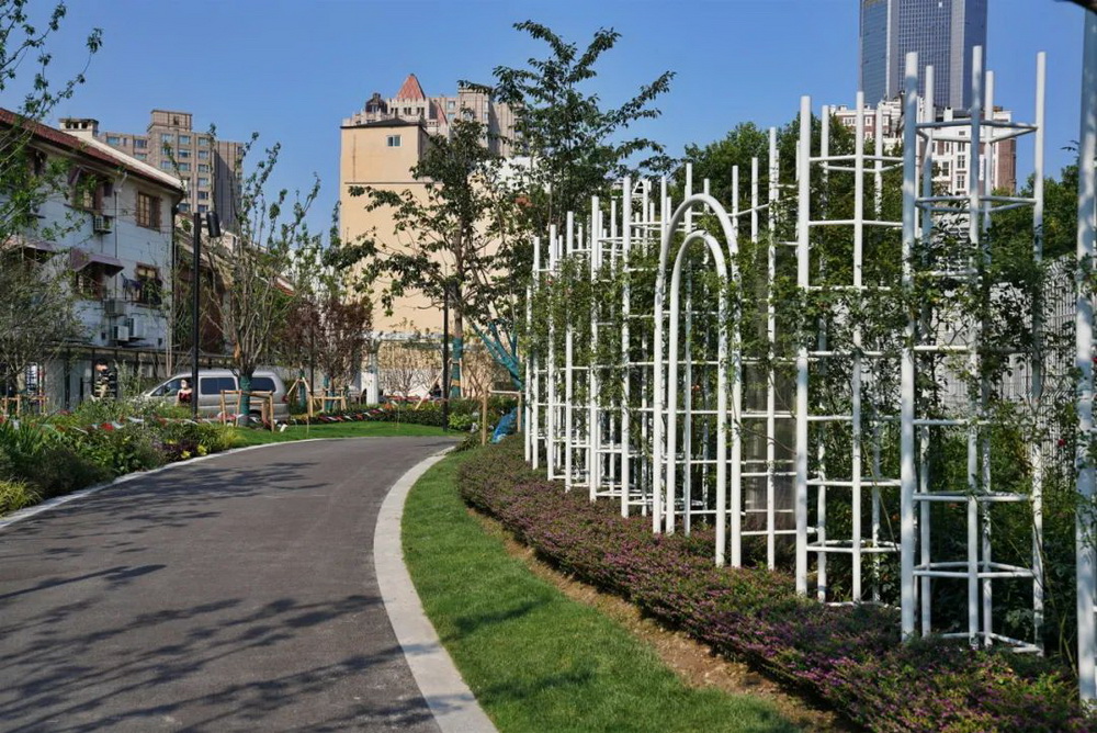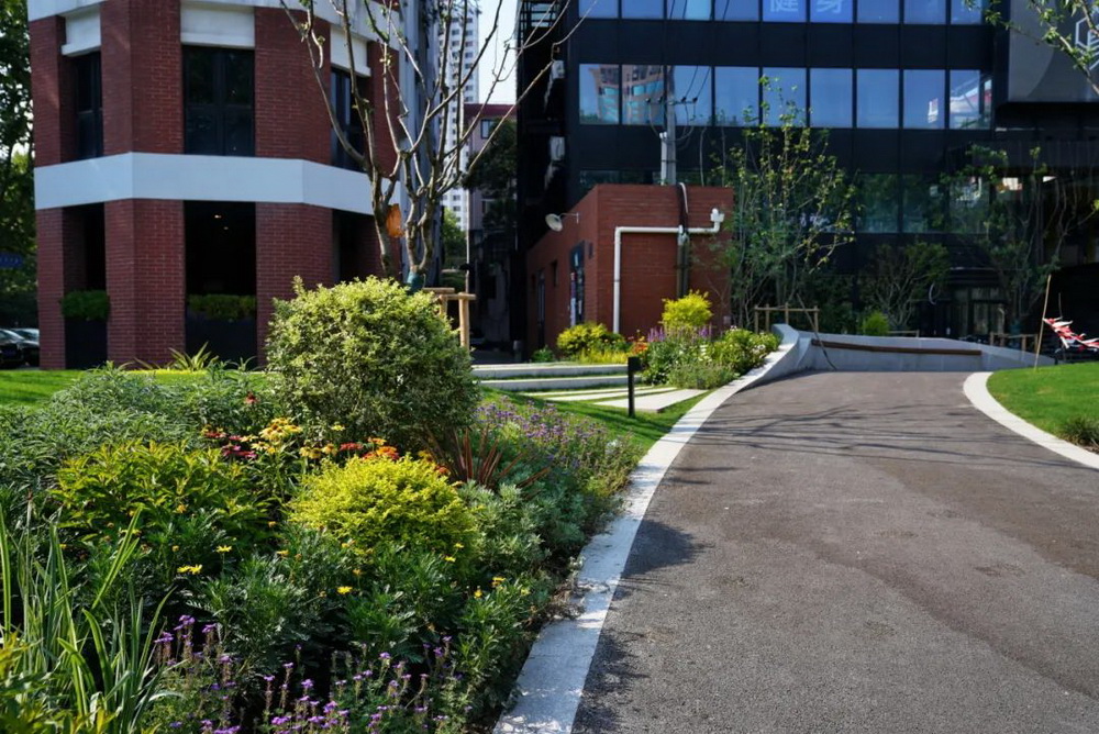 這個小花園肩負(fù)著多重使命,既要有老上海弄堂記憶的文藝范,又要有日常生活的煙火氣。作為長樂路上為數(shù)不多的綠色開放空間,滿足居民日常的綠色休閑需求的同時,兼顧著居民駕車出行、商家出入、市民探店、人行道穿行其間的多重需求。設(shè)計通過一條200m長的步行道,將碎片化的綠地串聯(lián)在一起,形成“東北幽、西南闊”的布局,在基地東北角配置亭廊構(gòu)架與坐憩設(shè)施,打造靜謐休憩空間,而在西南角,以起伏的草坡和自然花境,與喧鬧的街角隔而不檔,主題LOGO凸顯了這個長樂路上綠色新地標(biāo)的形象,一起加入city walk,探秘城市中的自然。