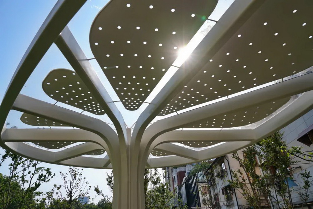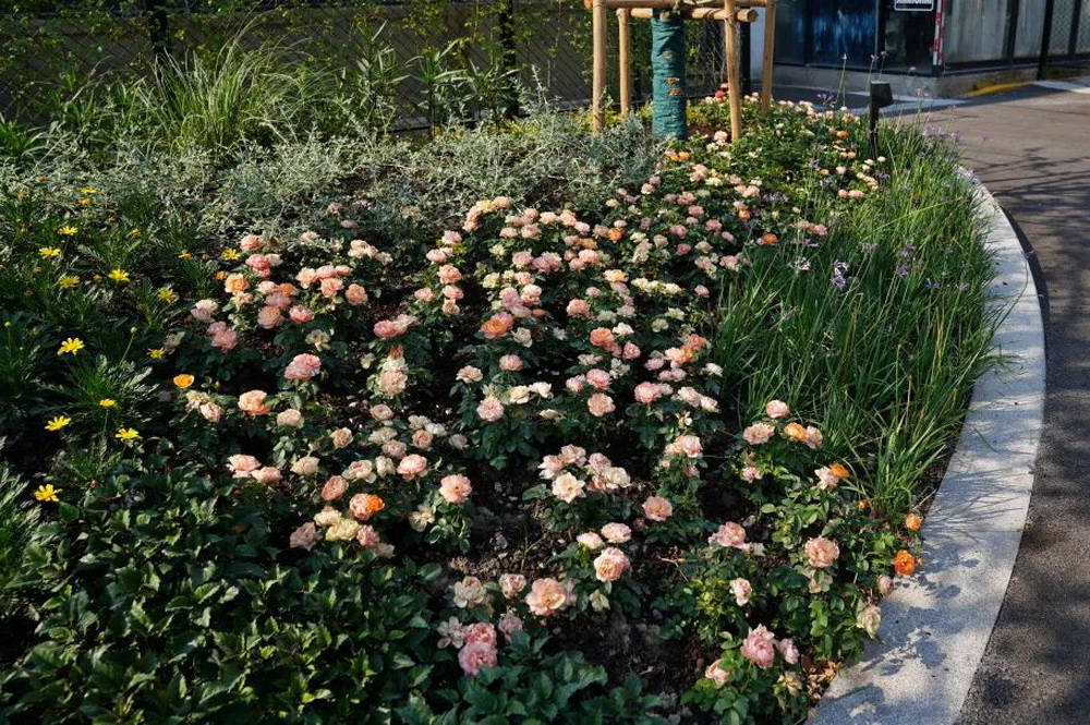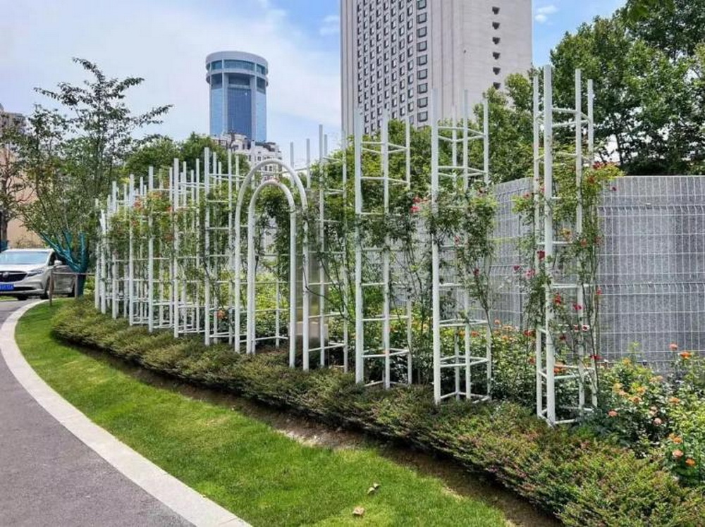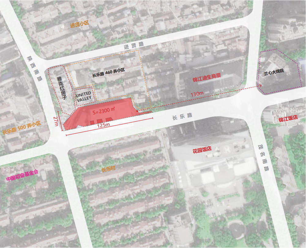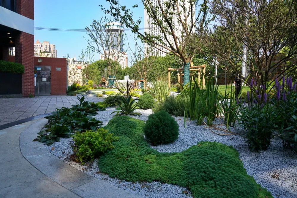這個小花園肩負(fù)著多重使命,既要有老上海弄堂記憶的文藝范,又要有日常生活的煙火氣。作為長樂路上為數(shù)不多的綠色開放空間,滿足居民日常的綠色休閑需求的同時,兼顧著居民駕車出行、商家出入、市民探店、人行道穿行其間的多重需求。設(shè)計通過一條200m長的步行道,將碎片化的綠地串聯(lián)在一起,形成“東北幽、西南闊”的布局,在基地東北角配置亭廊構(gòu)架與坐憩設(shè)施,打造靜謐休憩空間,而在西南角,以起伏的草坡和自然花境,與喧鬧的街角隔而不檔,主題LOGO凸顯了這個長樂路上綠色新地標(biāo)的形象,一起加入city walk,探秘城市中的自然。