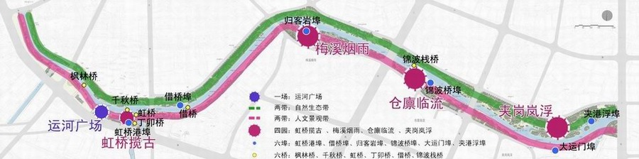 鎮(zhèn)江古運(yùn)河風(fēng)光帶規(guī)劃基于“南山北水·運(yùn)河相牽”的鎮(zhèn)江城市格局及古運(yùn)河中段的周邊環(huán)境資源,從“水、岸、景、城”相融共生的角度,以打造聯(lián)動(dòng)“南山北水”、激活“城市山林”、優(yōu)化“旅游格局”的運(yùn)河休閑風(fēng)光帶為目標(biāo),確立古運(yùn)河中段“兼容古今、顯山露水、親水樂(lè)水”的全新景觀與功能定位,形成“一場(chǎng)、兩帶、四園、六橋、六埠”的布局結(jié)構(gòu),展現(xiàn)“百里繁華一水牽”的休閑運(yùn)河景觀風(fēng)貌。