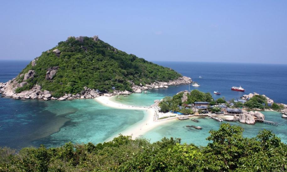 南園島(Koh Nang Yuan)臨近蘇梅島,登高而望,可見其其由三座島構(gòu)成,兩邊島比較高,中間島低平,細(xì)長的人字形白沙灘將三島連在一起,漲潮時(shí)沙灘會被淹沒,但仍然可以蹚水過去。白沙沙灘可以直接下海,海底色彩斑斕,非常美麗,是一個不可多得的浮潛圣地。