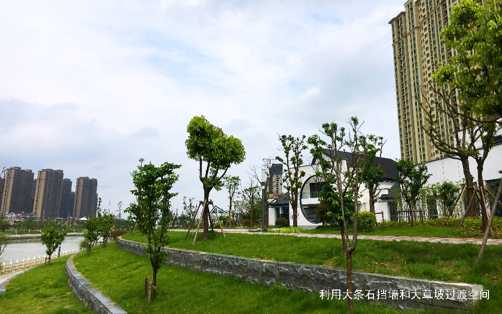 基地位于江蘇省丹陽市,總面積121543平方米。設計利用“橫向透、縱向融”的設計策略,打造“串古連今的活力景觀帶”,構(gòu)建“一廊兩帶兩翼三區(qū)六景”的總體布局結(jié)構(gòu),營造丹陽市“城市客廳”的“全景陽臺與休閑綠毯”。設計巧妙利用各種斜坡、臺地、擋墻,解決基地內(nèi)的高差問題,結(jié)合植物種植開辟透水線、分級設置場地空間,形成了親切多元的濱水空間與生態(tài)界面;自行車慢行系統(tǒng)貫穿全線,串聯(lián)起各個不同的活動空間,并成為丹陽綠道體系的構(gòu)成部分;新江南風格的院落式配套建筑空間,有機地融于綠地中,并通過漏窗、連廊、庭院達到室內(nèi)外空間的相互滲透。打造丹陽地區(qū)最具特色的集健身、運動、游覽、商業(yè)休閑體驗于一體的開放式帶狀公園。