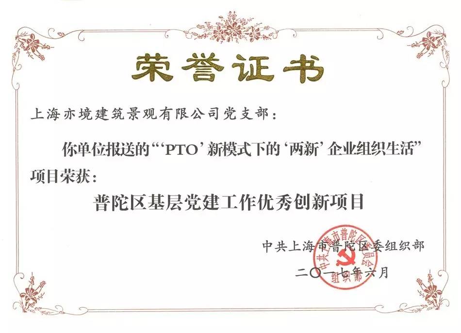 亦境PTO創(chuàng)新支部生活模式在今年六月的評比活動中,榮獲普陀區(qū)組織部頒發(fā)的“普陀區(qū)基層黨建工作優(yōu)秀創(chuàng)新項目”。