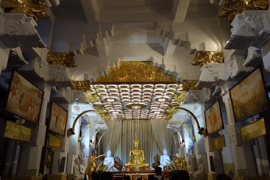 內(nèi)殿的天花板上布滿了彩繪和金飾,十分華麗。正中是一尊金光燦燦的巨大坐佛,佛前有朵朵蓮花和佛燭桌案,香火繚繞不絕。內(nèi)殿中有一處暗室,便是佛牙所在的地方。每天早晨、中午和黃昏會(huì)定時(shí)開放三次內(nèi)殿和暗室供人禮拜,每次通常半小時(shí)左右。信徒們會(huì)在這段時(shí)間內(nèi)瞻仰佛牙、祈禱膜拜,游客也能感受到其中虔誠(chéng)肅穆的氛圍。