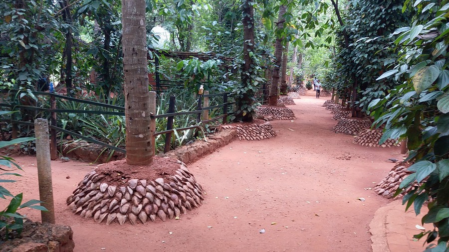 斯里蘭卡中部高山地區(qū),便是香草園集中地。偌大的園林內(nèi)花草繁盛,據(jù)講解員介紹,園內(nèi)的香草種類便超過(guò)85種,只見他隨手摘來(lái),看似平凡的花草,原是胡椒、黃姜、肉桂、豆寇、丁香、檀香及云呢拿等,都是當(dāng)?shù)厝顺S玫?/span>香料。園中椰果皮堆砌成的樹池卻是我們眼中最大的亮點(diǎn),對(duì)當(dāng)?shù)夭牧系囊虻刂埔说倪\(yùn)用,生態(tài)美觀。