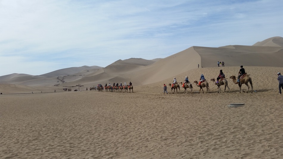 鳴沙山位于敦煌市南6公里的沙鳴山北麓,沙峰起伏,金光燦燦,宛如金山。在陽(yáng)光下一道道沙脊呈波紋狀,黃濤翻滾,明暗相間,層次分明。狂風(fēng)起時(shí),沙山會(huì)發(fā)出巨大的響聲,輕風(fēng)吹拂時(shí),又似管弦絲竹,因而得名為鳴沙山。敦煌鳴沙山在漢代稱沙角山,又名神沙山,晉代始稱鳴沙山。