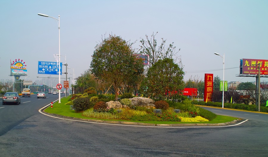 設(shè)計(jì)特色:1) 以“土阜連綿、高樹低丘”的江南自然景觀模式為依據(jù),以鄉(xiāng)土植物為主體,構(gòu)建以落葉喬木為骨架的8個植物景觀群落類型。2)采用“島鏈?zhǔn)健钡牟季帜J剑瑥摹皢我痪€性”空間走向“島鏈?zhǔn)健笨臻g結(jié)構(gòu);適量增加鄉(xiāng)土及彩葉植物,從“綠色入城通道”走向“多彩迎賓大道”。