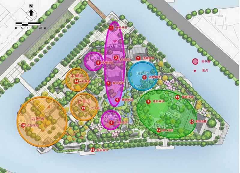 提煉綜合溧陽城宋代以來已廢棄的十余處古園林的意趣精髓,傳承中國明清江南古典集錦式山水園之園中園的造園技法,因地制宜,藉山水、建筑和植物造景烘托景觀主題,設(shè)計(jì)形成“八園十六景”的總體景觀格局,充分表現(xiàn)場所精神,展示當(dāng)?shù)貍鹘y(tǒng)民族文化特色。