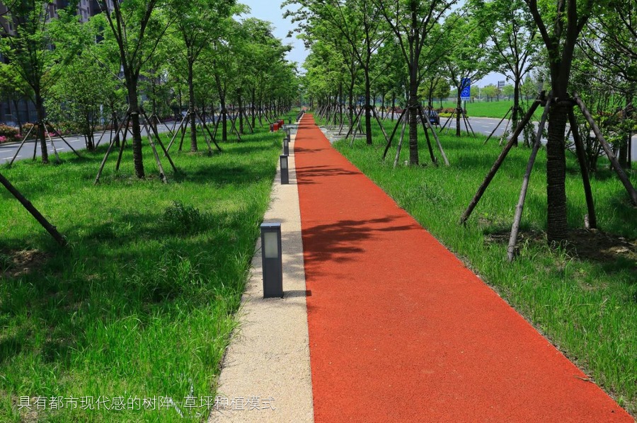 4)綠化帶中的人行步道是具備透水功能的跑道,設(shè)計過程中保留原有樹種。