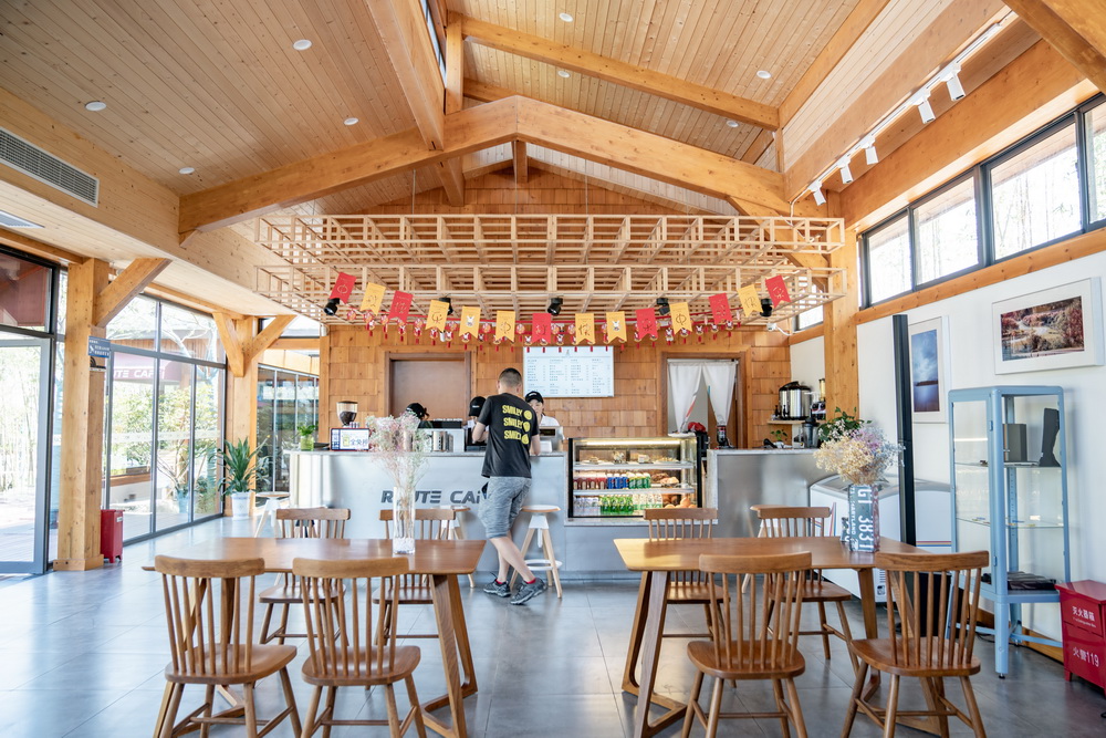 走進(jìn)驛站,建筑內(nèi)部原生木材的構(gòu)架質(zhì)樸地交織在一起,木材的清香與咖啡香味擁抱在一起。品山賞林,只愿時光凝固……