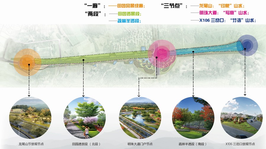 設計采用1+1+1>3的策略,形成一套組合拳,構建了“一廊·兩段·三節(jié)點”景觀格局,最大程度地提升的道路空間的景觀效果。解決了“優(yōu)美的背景資源未能利用,綠帶較窄,坡度大,綠帶與周邊環(huán)境不融合”等現(xiàn)狀問題。