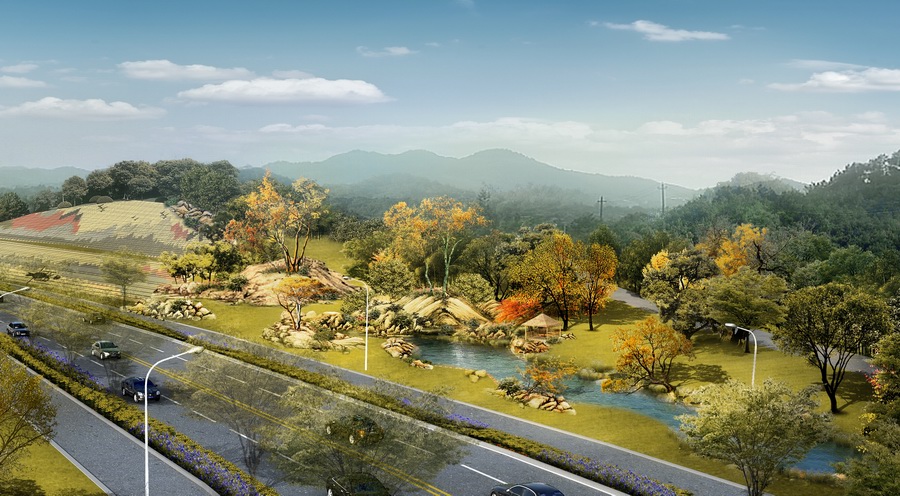 長山大道,是自溧陽城區(qū)進入天目湖景區(qū)的北端門戶。設計提出實現(xiàn)“公路綠化”向“風景路景觀”的轉變的目標,著重演繹“竹語山水,印象天目”的景觀主題,以打造展示溧陽天目湖形象,兼具生態(tài)防護、休閑游憩功能的“門戶型”山水風景路。