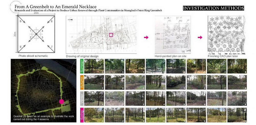 首先,從生態(tài)功能角度評估綠帶植物群落的問題和優(yōu)勢,同時探索外環(huán)林帶增加復合功能的可能性。結合城市更新發(fā)展新需求,將外環(huán)林帶分成不同功能導向的綠地,分析和總結其一般模式,提出優(yōu)化模式,將優(yōu)選群落和優(yōu)化群落模式應用與上海環(huán)城綠帶的改造和建設中。本研究與政府相關管理部門合作進行,研究范圍廣,具有一定的時間跨度以及學科交叉的融合。