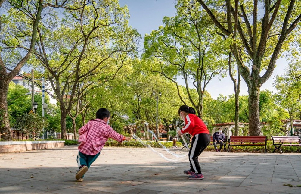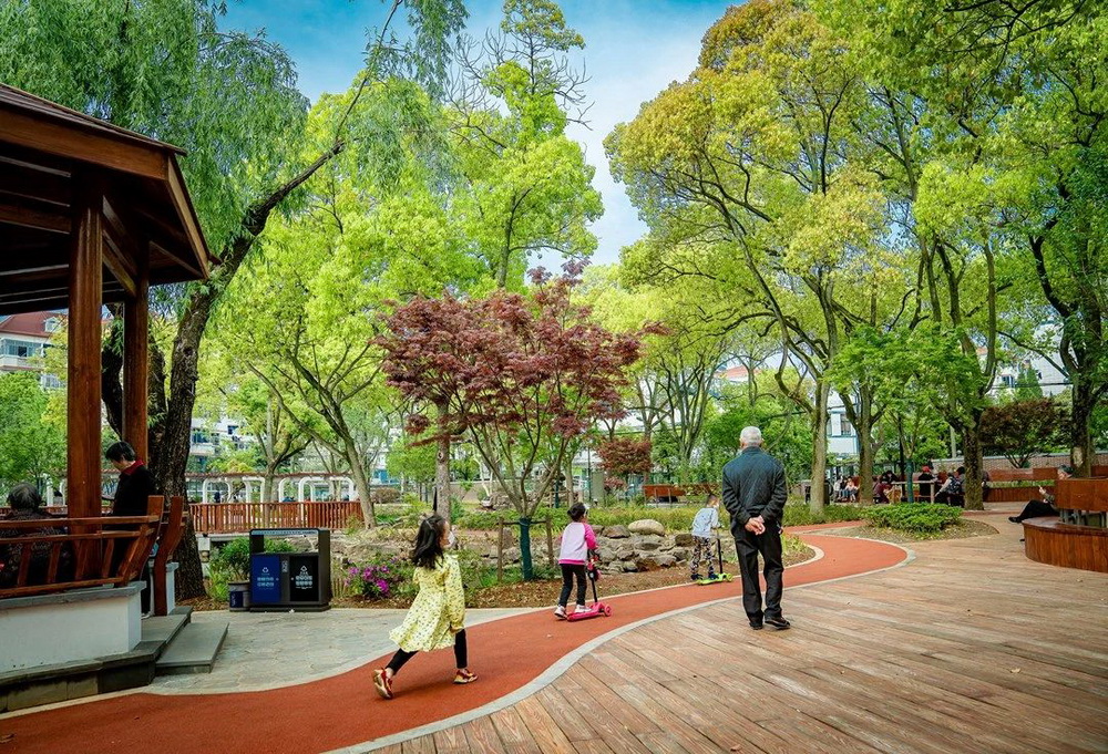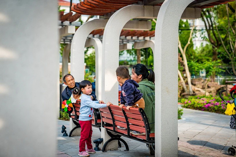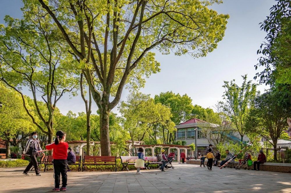 “早啊,又來(lái)鍛煉啦!”,“今天去哪里下棋?”......一大早,人樂(lè)社區(qū)內(nèi)的小游園里已經(jīng)充滿了煙火氣。幾位古稀老人在木棧道上散步,精神矍鑠;幾位爺叔圍坐在四人小桌前,“排兵布陣”,神情凝重;幾位阿姨在長(zhǎng)廊下,環(huán)抱孩童,盡享天倫;歡聲笑語(yǔ)充滿這個(gè)老城區(qū)的新花園中……