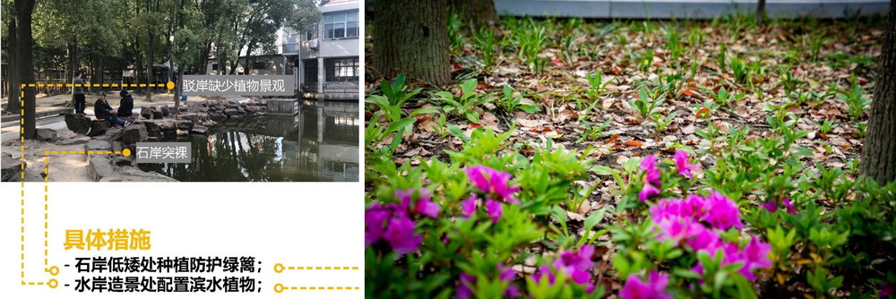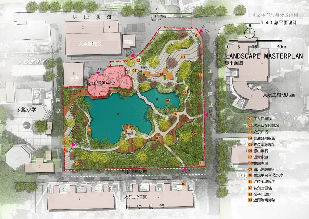 人樂(lè)花園的更新設(shè)計(jì)方案進(jìn)一步明確了功能分區(qū)、集約活動(dòng)場(chǎng)地、完善配套設(shè)施;梳理游園邊界、增設(shè)出入口、提升游園的可達(dá)性;抽稀上層喬木,增種紅楓、雞爪槭、月季、繡球等開(kāi)花與色葉植物,實(shí)現(xiàn)植物景觀增彩透綠、豐富四季景觀,水邊種植黃馨和球類植物解決景觀和安全問(wèn)題;濱水增設(shè)木棧道與親水平臺(tái),解決斷頭路問(wèn)題,連通濱水步道環(huán)線。改造后的人樂(lè)花園重?fù)Q“新顏”。游園的活動(dòng)空間品質(zhì)與社區(qū)居民的休閑體驗(yàn)將有大大的提升。