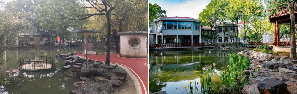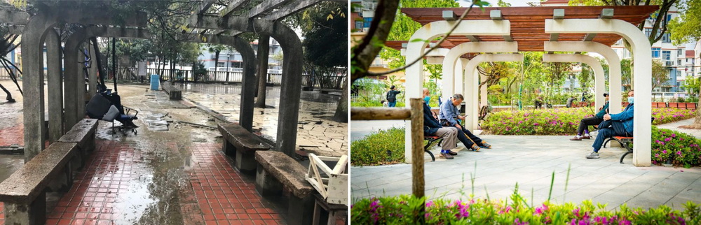↑ 湖面西側(cè)廊架改造前后