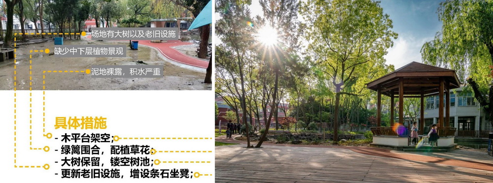 人樂(lè)花園自1980年代中期建園以來(lái),一直是社區(qū)居民樂(lè)于前往的“公共客廳”,人樂(lè)社區(qū)居民對(duì)小游園的感情很深,回憶很多。但游園內(nèi)活動(dòng)場(chǎng)地碎片化、設(shè)施老舊缺失,喬木過(guò)密導(dǎo)致林下空間光照不足、植被長(zhǎng)勢(shì)不佳,且人為踐踏嚴(yán)重......。