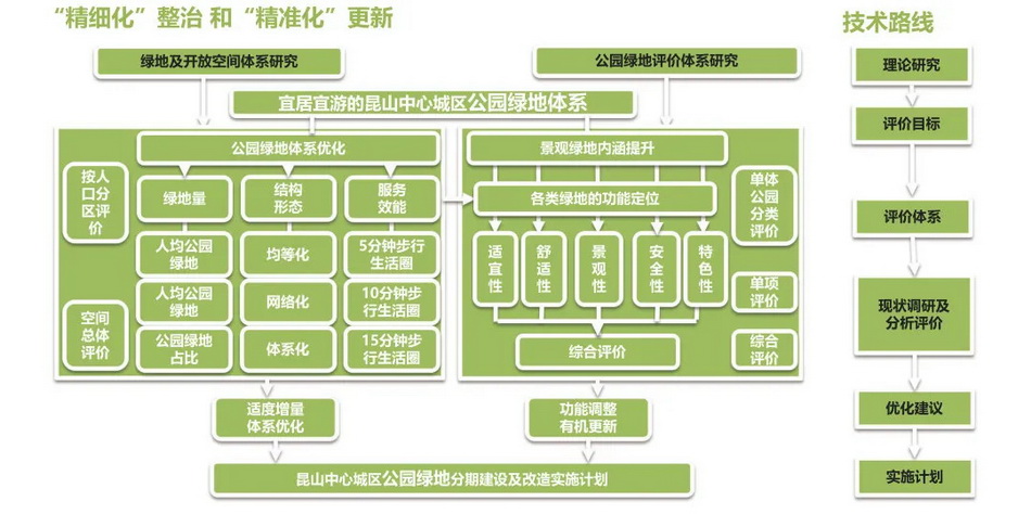 昆山中心城區(qū)河網(wǎng)密度高、水系發(fā)達(dá),但總體公園綠地量不足,且分布不均衡。本次規(guī)劃結(jié)合國(guó)內(nèi)外發(fā)達(dá)城市綠地研究,以“增量提質(zhì)”為出發(fā)點(diǎn),有針對(duì)性的提出了公園服務(wù)圈覆蓋系統(tǒng)和建成公園綠地分級(jí)評(píng)價(jià)體系,對(duì)昆山中心城區(qū)公園綠地進(jìn)行了系統(tǒng)的評(píng)估,提出了構(gòu)建了“一軸、兩廊、四環(huán)”的藍(lán)綠統(tǒng)籌公園體系、“城市閑置地”3大精準(zhǔn)覆綠模式和“昆小薇”小微公園建設(shè)行動(dòng)指南等建設(shè)指導(dǎo)規(guī)劃,打造具有前瞻性、標(biāo)桿性和實(shí)效性的創(chuàng)新型花園城市景觀(guān)。