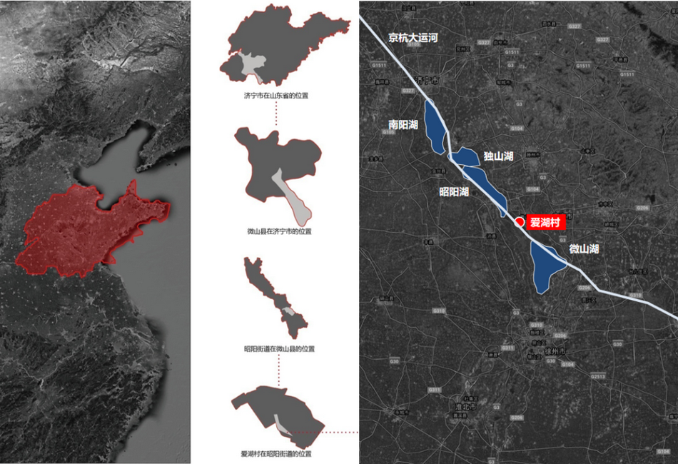本項(xiàng)目基地位于山東省微山縣昭陽街道愛湖村,愛湖村位處微山縣南北相連的昭陽湖、獨(dú)山湖、南陽湖、微山湖的中心地帶,京杭大運(yùn)河傍村而過。愛湖村地區(qū)自然生態(tài)環(huán)境良好,歷史文化資源豐富。臨湖而居的自然環(huán)境形成了“船幫”、“槍幫”等漁家文化,與此同時(shí),也是鐵道游擊隊(duì)抗日活動(dòng)舊址。