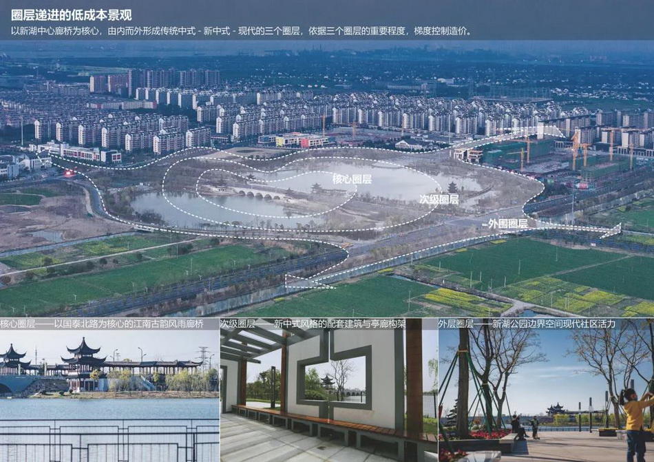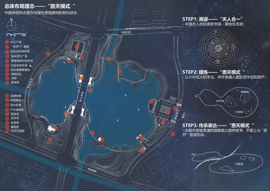 南北向貫穿公園的國泰路,將公園中的新湖水面劃分為大小不同的兩部分,聚分有致。平面形態(tài)與“葫蘆”極其相似。在總體布局中傳承和表達了這個中國古代理想生態(tài)環(huán)境的模板——“壺天模式”。總體布局上,設(shè)計以新湖中心廊橋為核心,由內(nèi)而外,形成傳統(tǒng)中式-新中式-現(xiàn)代的三個圈層: