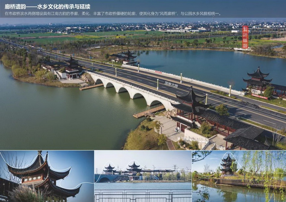 廊橋采用中國傳統(tǒng)園林中的藝術(shù)表達手法,結(jié)合湖中人工島上的三層景觀閣,形成廊橋與閣互為因借的景觀效果。