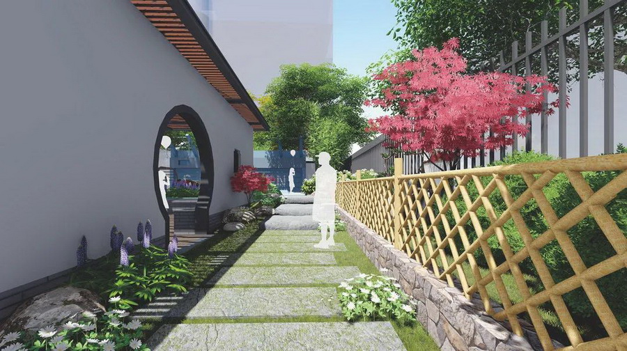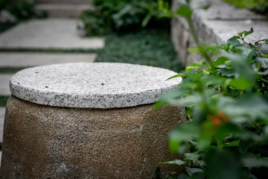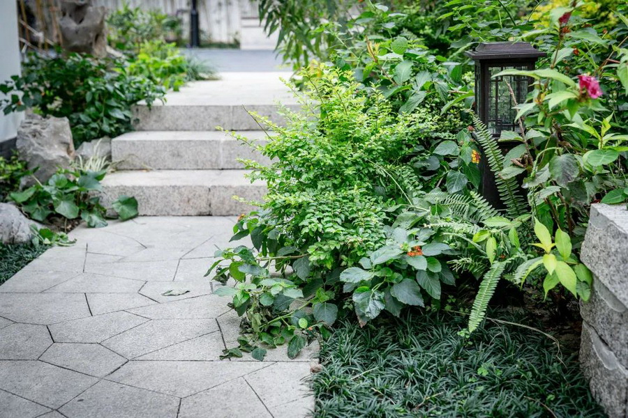 西北側(cè)設(shè)計一條汀步路,結(jié)合臺階、精致景觀燈、古井與花境的打造,把閉塞狹長的空間變成既具備交通功能又能較好的保持北側(cè)居住區(qū)的第一排居民的私密性,同時增加了精致人文氣息。