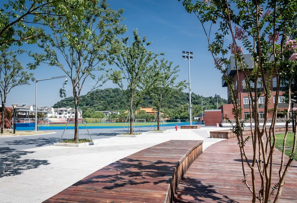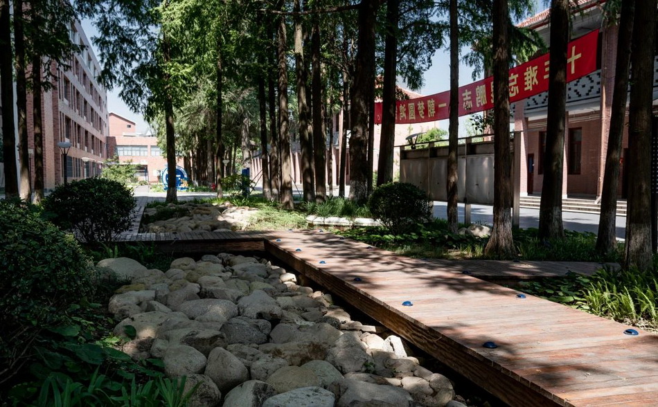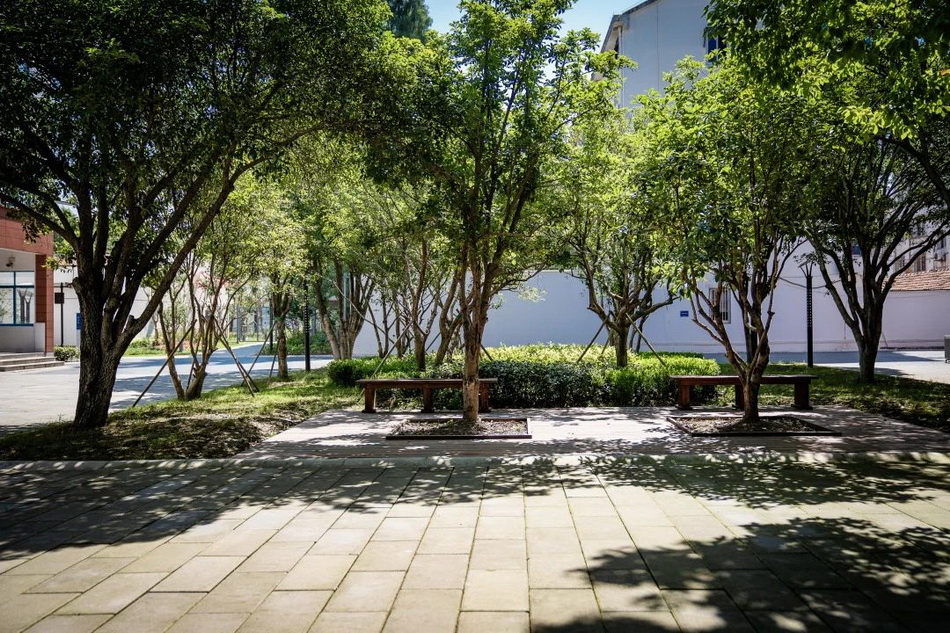 教學(xué)樓間的庭院花園保留原有喬木,流暢交通道路,增加停留座椅,自由形態(tài)的空間布局幫助師生們舒緩壓力,放松心情。