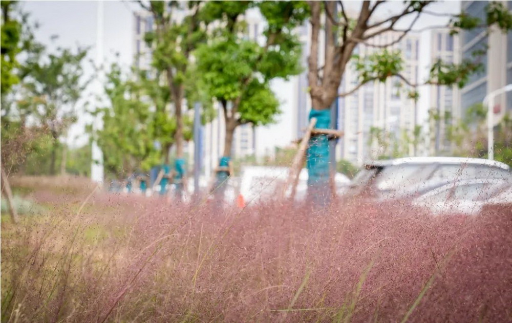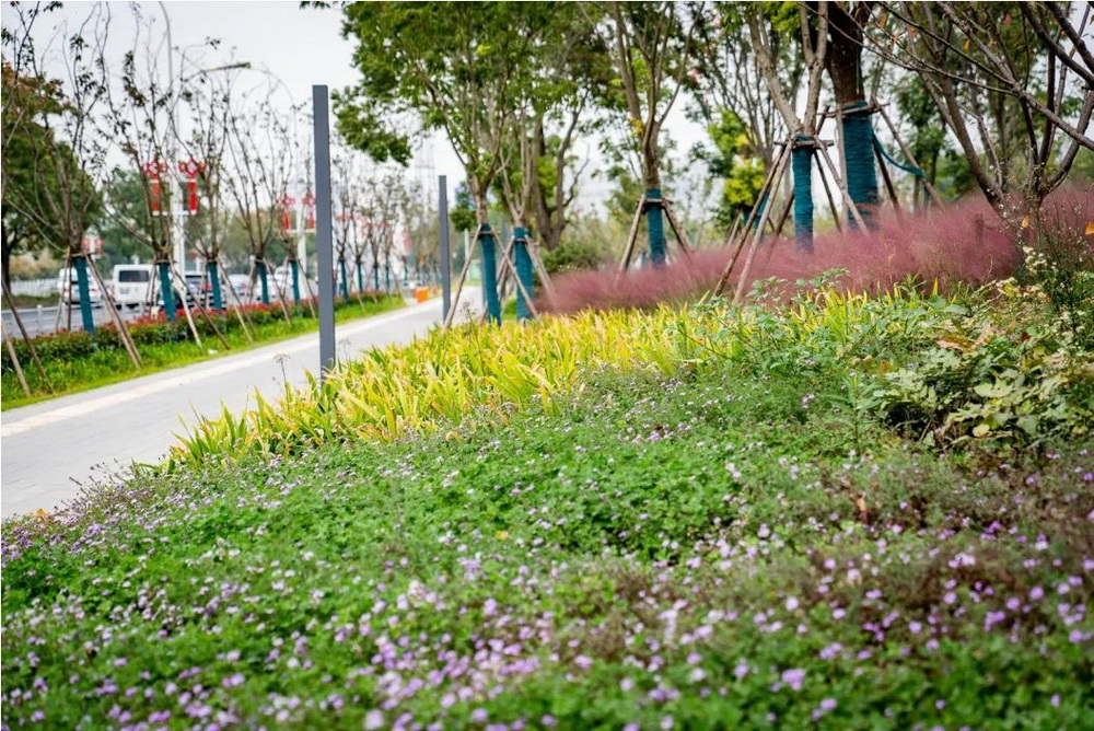 秉承安全交通、低成本維護(hù)的生態(tài)設(shè)計(jì)理念,通過充分的現(xiàn)場(chǎng)調(diào)查,保留現(xiàn)狀近90%的喬木,依據(jù)光照、地形等自然條件替換近70%的多年生地被植物,將原有的綠色大道轉(zhuǎn)變?yōu)樨S富季相變化的彩色廊道,提升道路城市界面的生態(tài)性與美觀性。