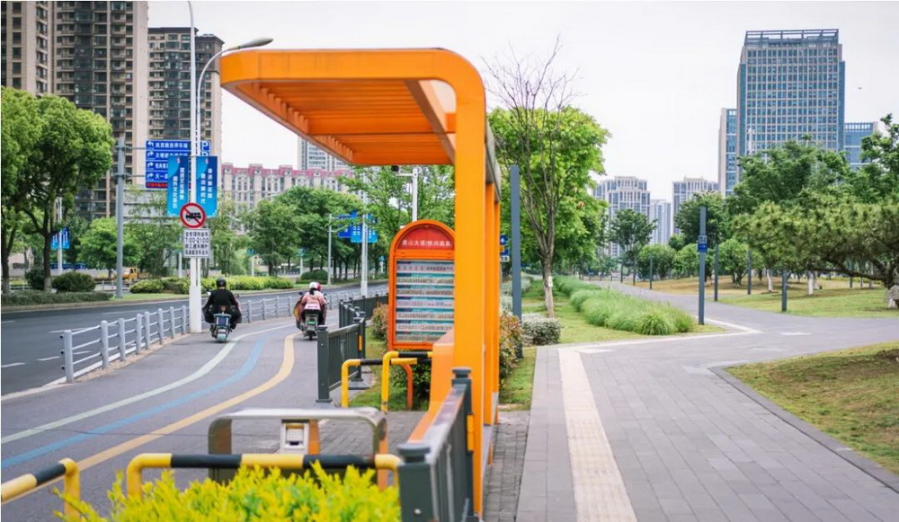 基于“綠化”、“彩化”、“人文化”的策略,將錫澄聯(lián)動(dòng)主軸的“橙色”作為標(biāo)志色,打造全齡化,時(shí)尚化的公交站臺(tái)與休憩設(shè)施。