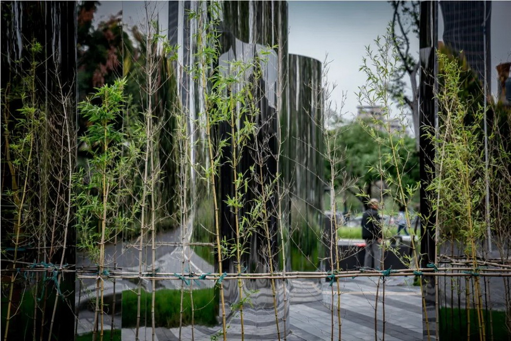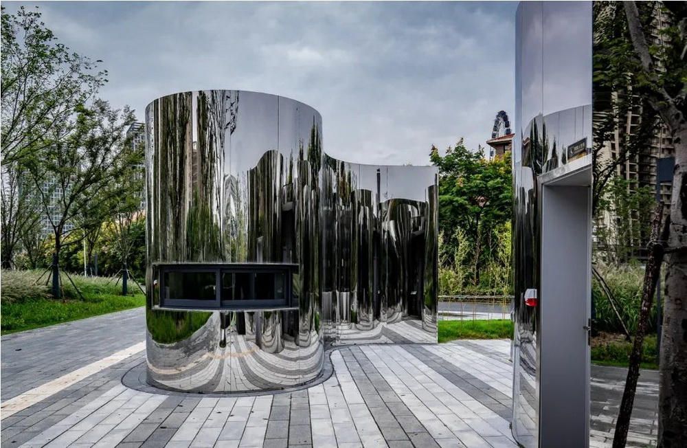 將公共服務(wù)設(shè)施“藏”綠,利用保留林帶區(qū)域?qū)⑿l(wèi)生間進(jìn)行形態(tài)消隱,利用鏡面不銹鋼材料反射周邊綠化環(huán)境形成材料的效應(yīng),體現(xiàn)建筑與自然的和諧共存。