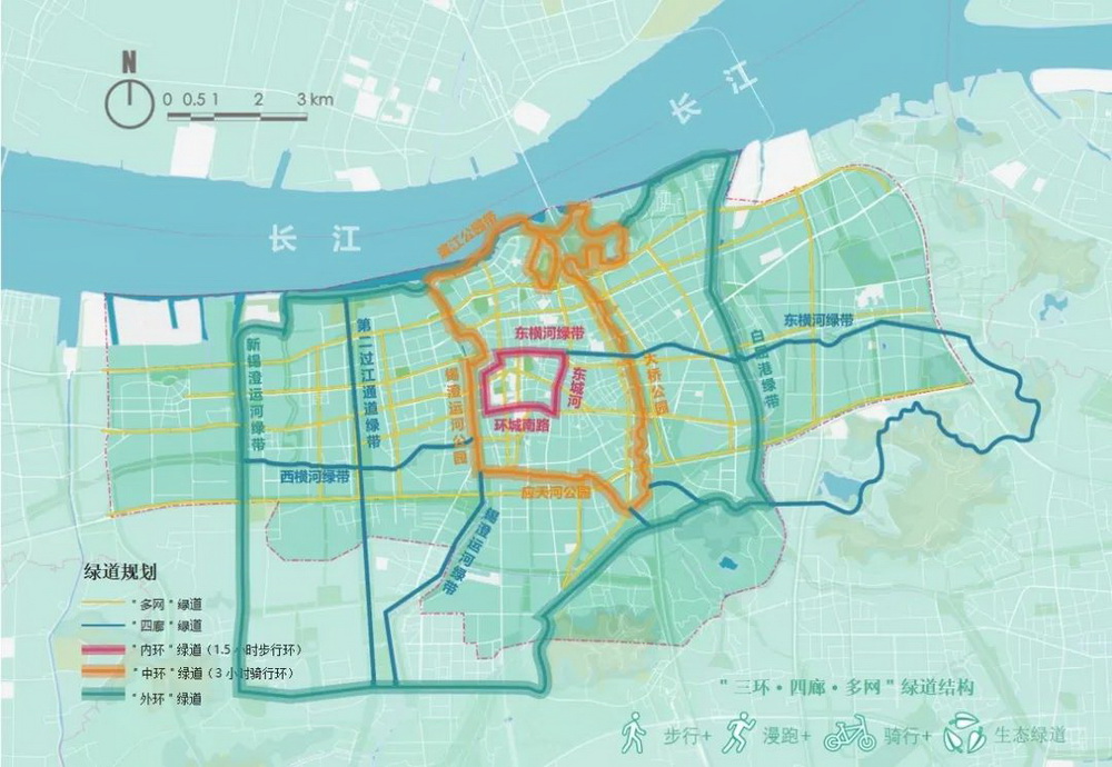 依托公園、道路與水系綠地的挖潛,新增公園綠地面積600hm2+,新增綠道178.15km、綠道長度達到203.80km,新創(chuàng)建綠地寬度在40~50m的生態(tài)達標道路17.53km;新創(chuàng)建3.07km林蔭路,林蔭路推廣率大于85%。