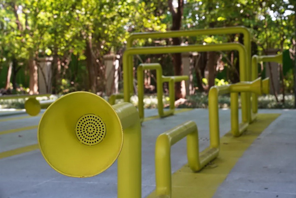 金屬網(wǎng)格柵彩繪森林圖案、地面明亮的黃色鋪裝一氣呵成、弧形汀步生動(dòng)有趣,鮮活跳躍,猶如夏日中的螢火蟲(chóng)圍繞場(chǎng)地飛舞。