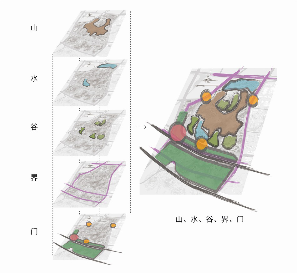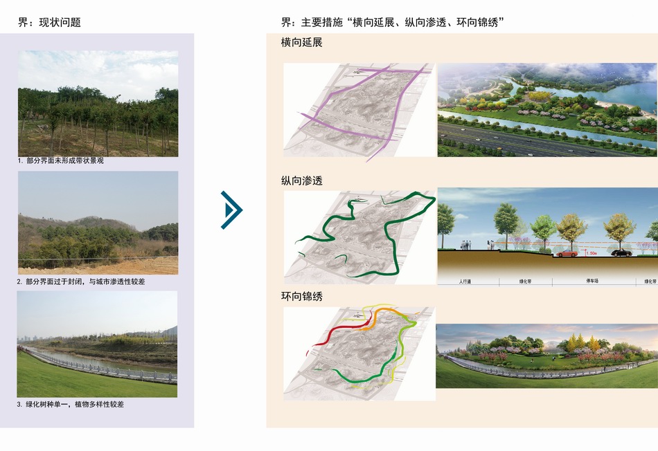 界——以“橫向延展、縱向滲透、環(huán)向錦繡”為原則,將公園景觀更好的融入城市空間,達(dá)到提升公園品質(zhì),美化城市環(huán)境的目的,有效的縫合城市與公園的關(guān)系。