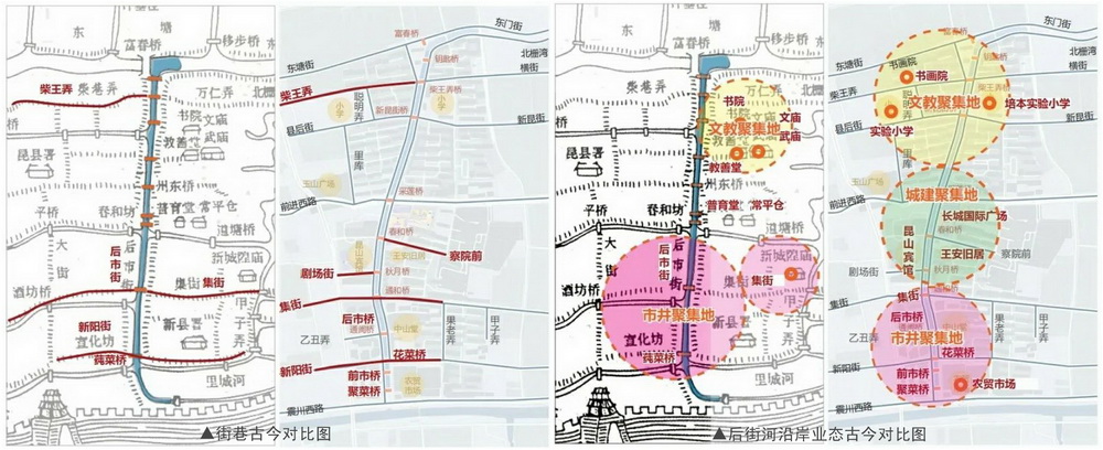 昆山市老城區(qū)致和塘與后街河組成的“T”字水軸兩岸,該區(qū)域自宋代起,即為昆山舊址新陽(yáng)縣城的核心商業(yè)貿(mào)易區(qū),周邊尚存街巷里弄、文人舊宅及私家園林等歷史文化資源,歷史底蘊(yùn)深厚。