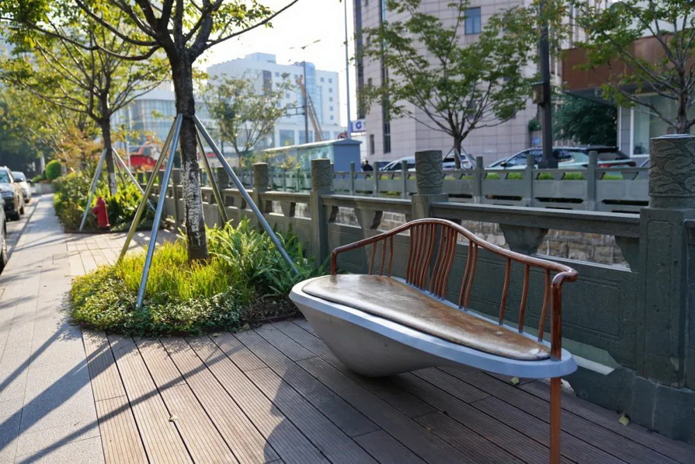隱園緊鄰后街河,承繼昆山名人“電腦大王”王安的舊居“隱廬”之名,采用藏、引結(jié)合的空間組織手法,將街角閑置地營(yíng)造為集游憩與人文展示于一體的復(fù)合空間。本次改造中,沿河梳理苗木,在隱園入口臨河側(cè)增加休憩場(chǎng)地,融入帶有明式家具風(fēng)格的藝術(shù)座椅,優(yōu)化沿河步行走廊休憩功能性。
