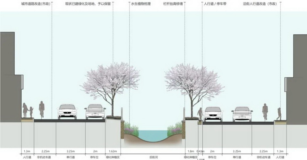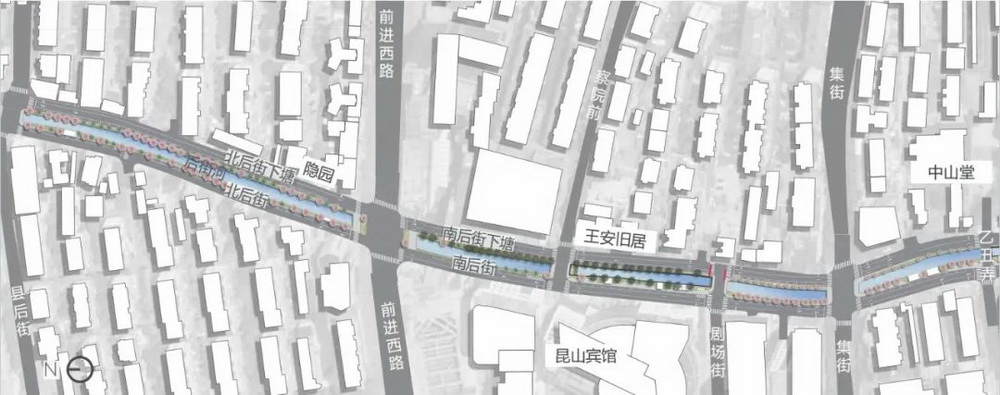 該區(qū)段以昆山首條地鐵11號(hào)線所在道路前進(jìn)西路為中心,包含南北各一個(gè)街區(qū),其中前進(jìn)西路以北為北后街及北后街下塘,南側(cè)為南后街及南后街下塘,河道寬度4.5-8m,水岸綠化寬度,西岸3-5m,東岸2-3m,水岸落差1.6m。